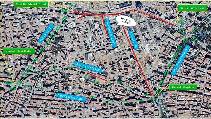 Çalışmaların güvenli ve planlı bir şekilde yürütülebilmesi için, İnönü Caddesi- Eski Kız Meslek Lisesi Kavşağı ile Sivas Caddesi-Atatürk Caddesi kesişimi (Kışla Saat Kulesi)arası ve Fuzuli Caddesi ile Şehit Servet Aktaş Caddesi03.01.2026tarihinden itibaren ikinci bir duyuruya kadar araç trafiğine kapatılacaktır.